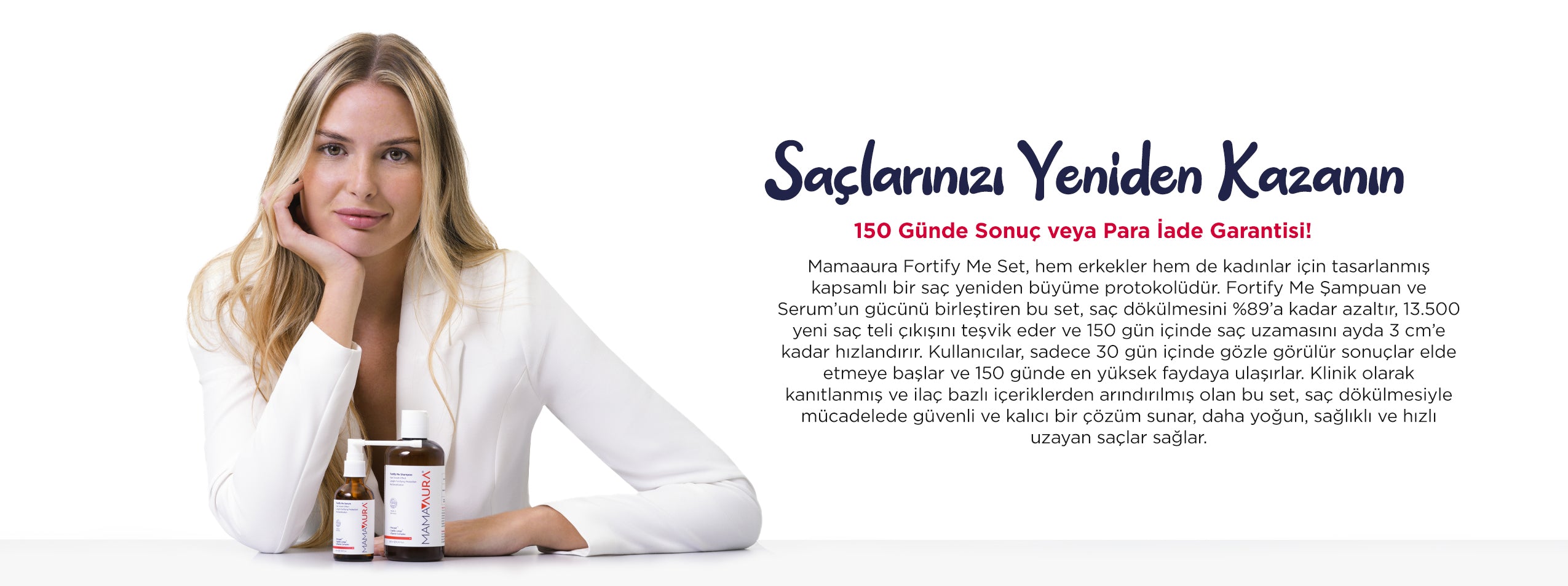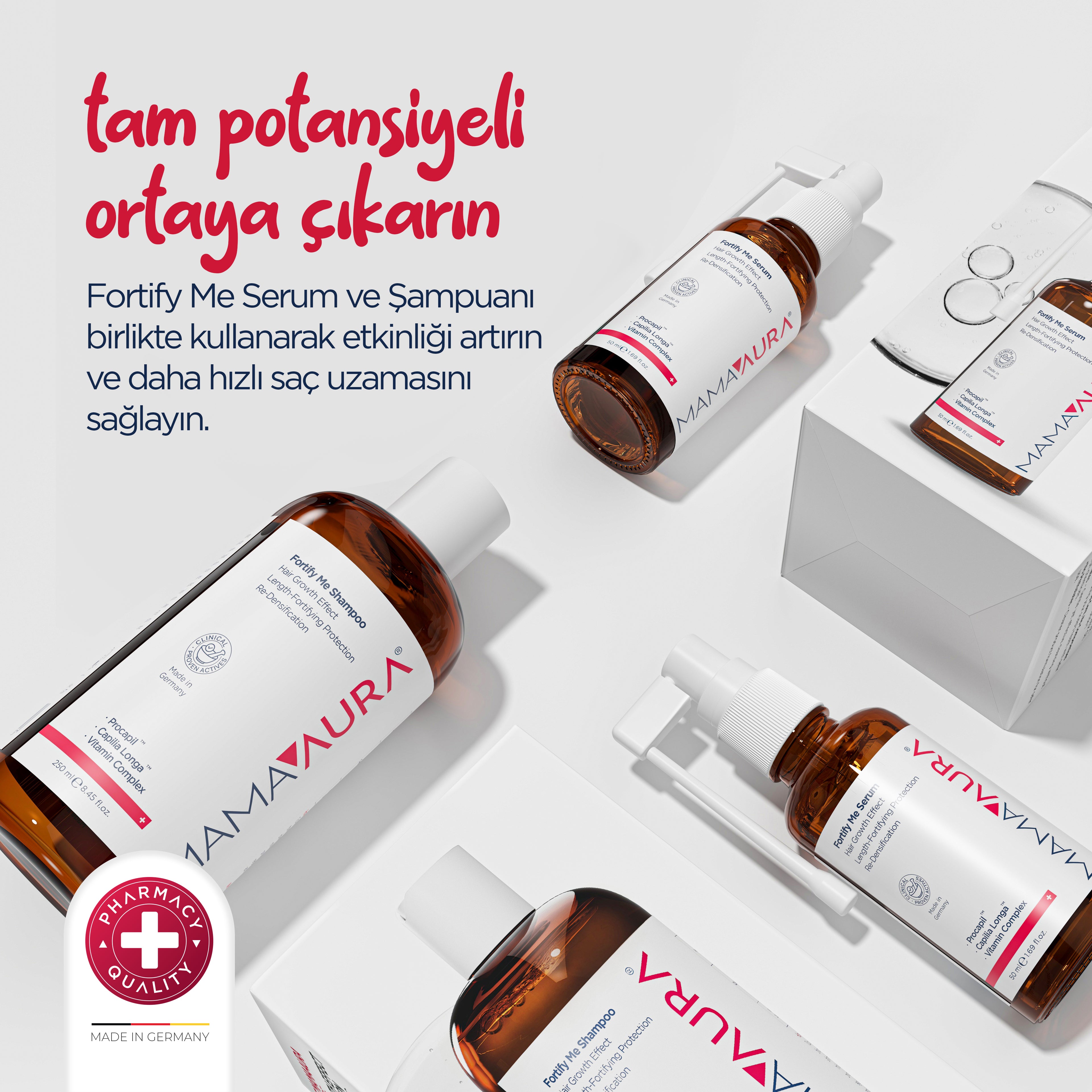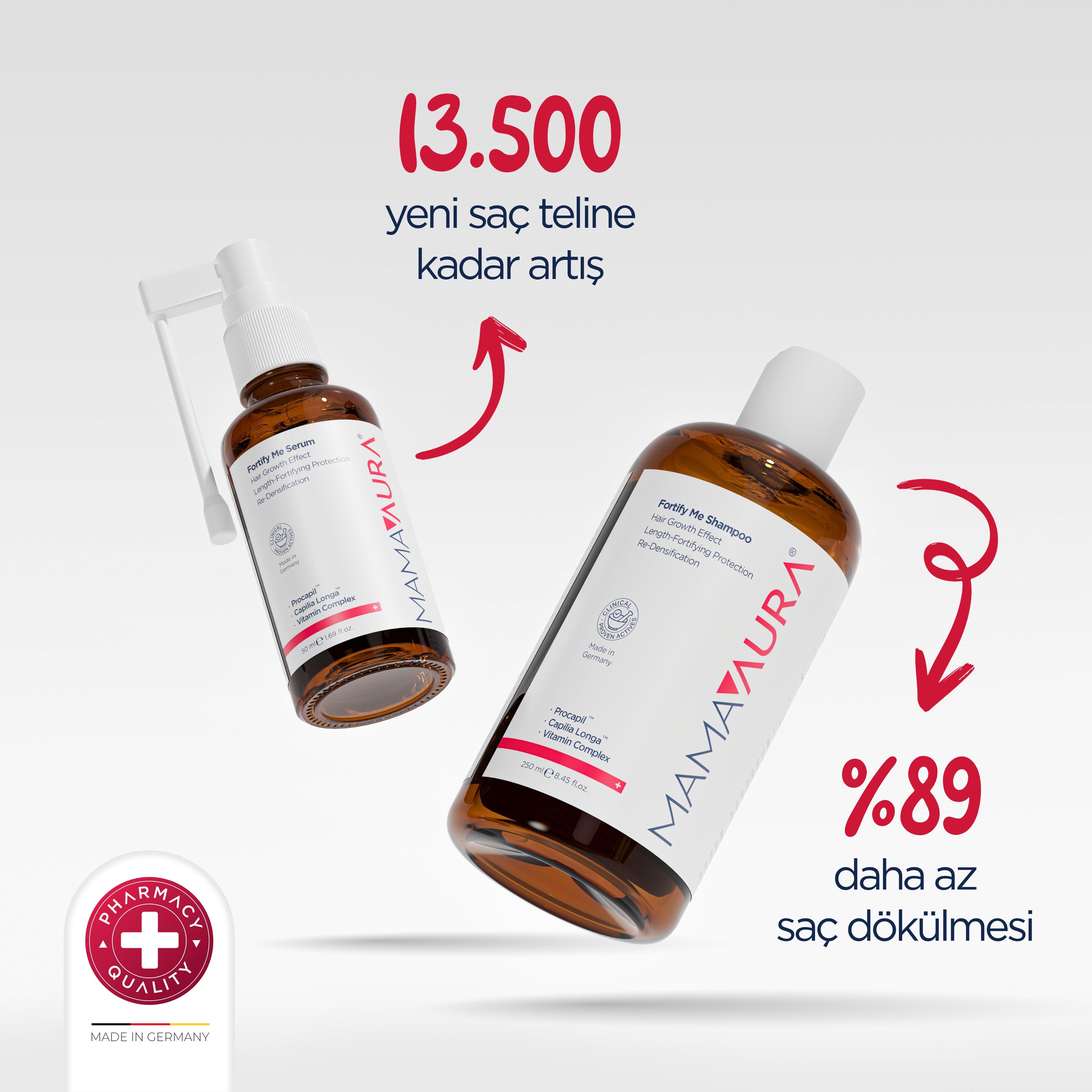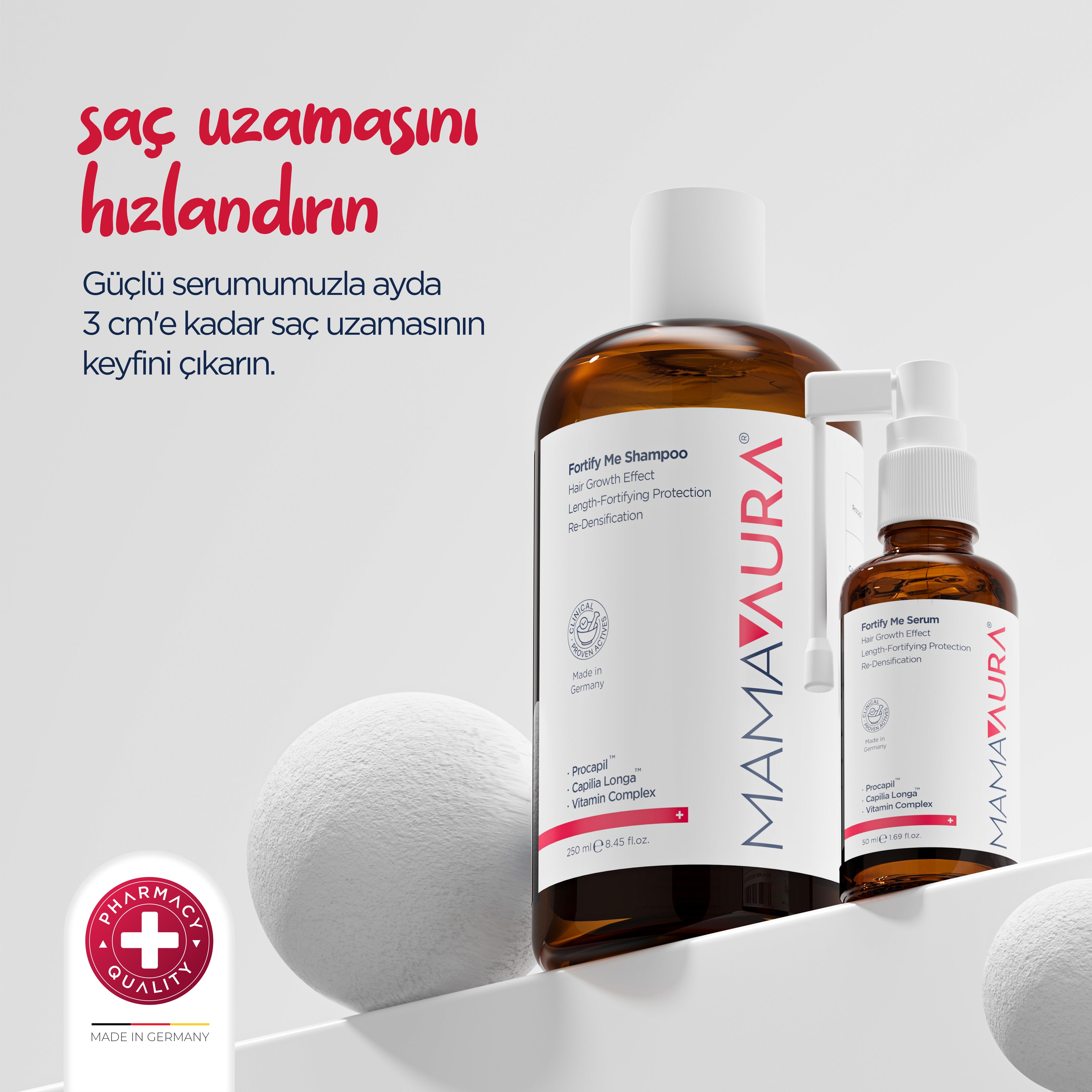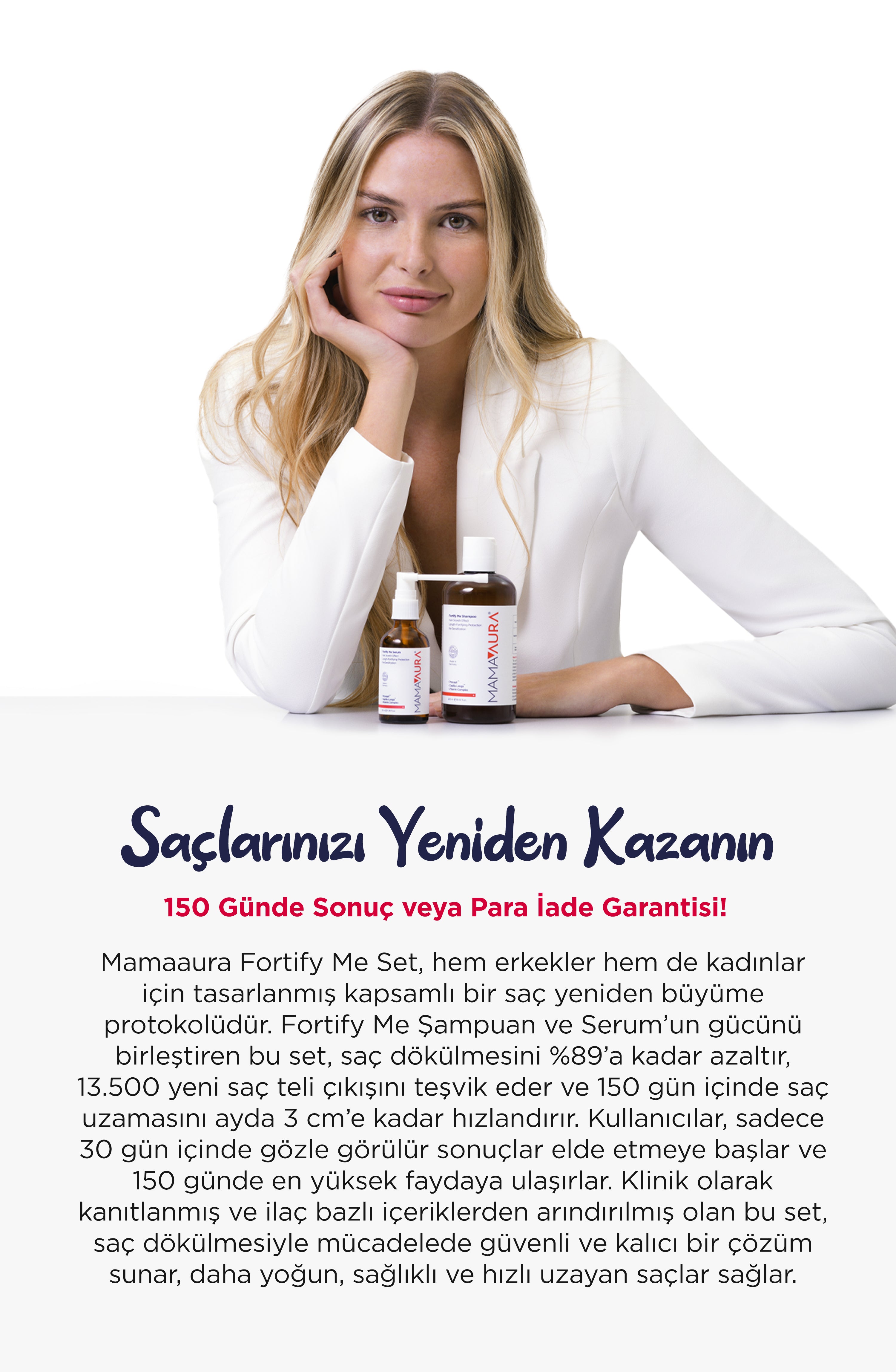 Mamaaura Fortify Me Set, hem erkekler hem de kadınlar için tasarlanmış kapsamlı bir saç dökülmesi uzmanıdır. Fortify Me Şampuan ve Serum'un gücünü birleştiren bu set, saç dökülmesini %89'a kadar azaltır, 13.500'e kadar yeni saç telinin çıkışını teşvik eder ve 150 gün içinde saç uzamasını ayda 3 cm'e kadar hızlandırır. Kullanıcılar, sadece 30 gün içinde gözle görülür sonuçlar almaya başlar ve en iyi sonuçlar 150 günde elde edilir. Klinik olarak kanıtlanmış ve ilaç bazlı bileşenler içermeyen bu set, saç seyrelmesine ve dökülmesine karşı güvenli ve etkili bir çözüm sunarak daha yoğun, sağlıklı ve hızlı uzayan saçlar sağlar.