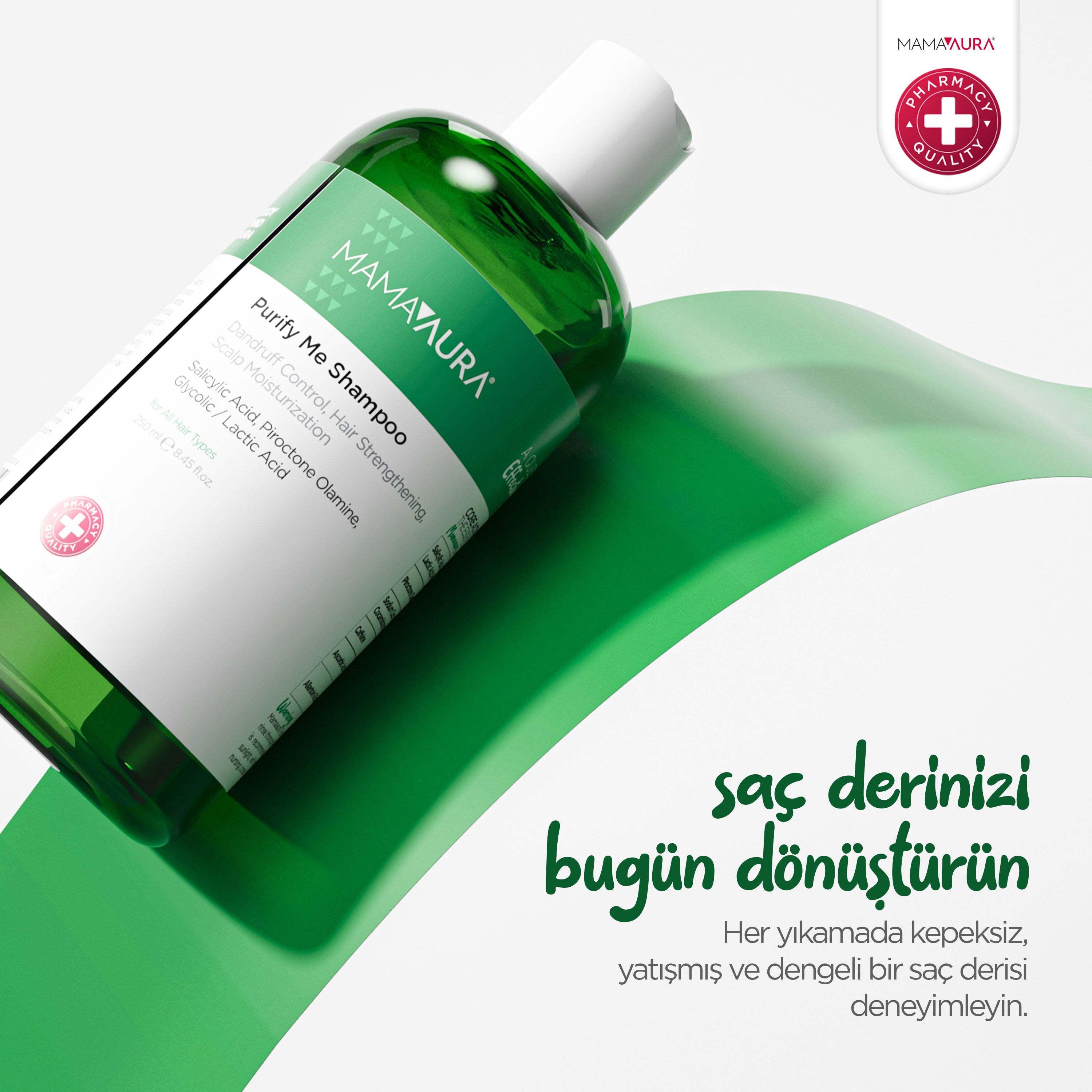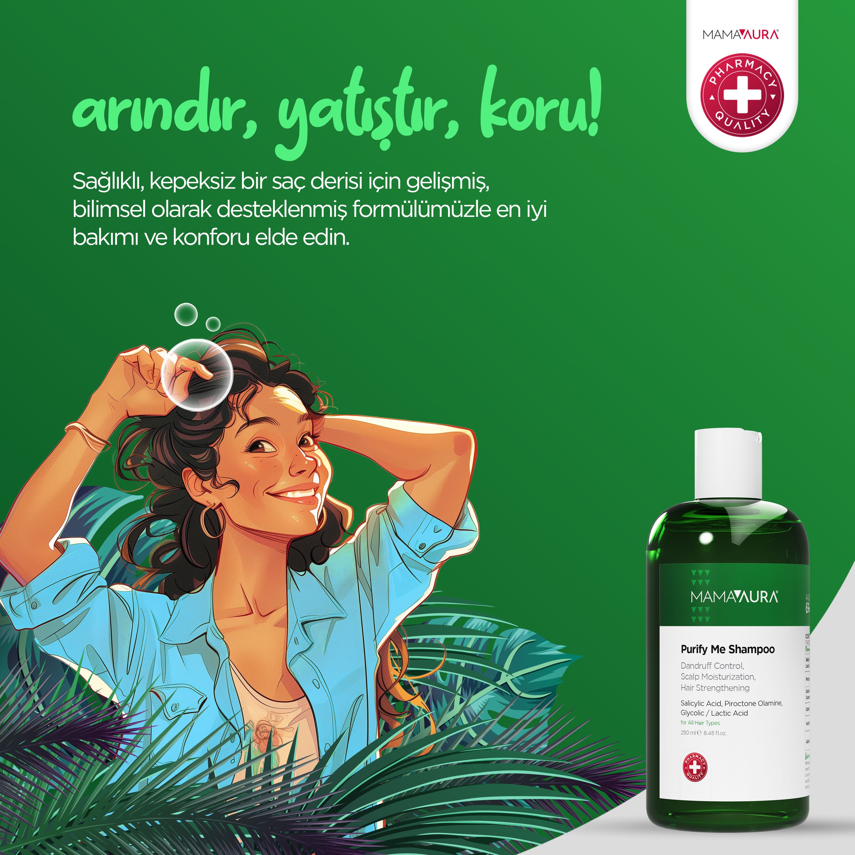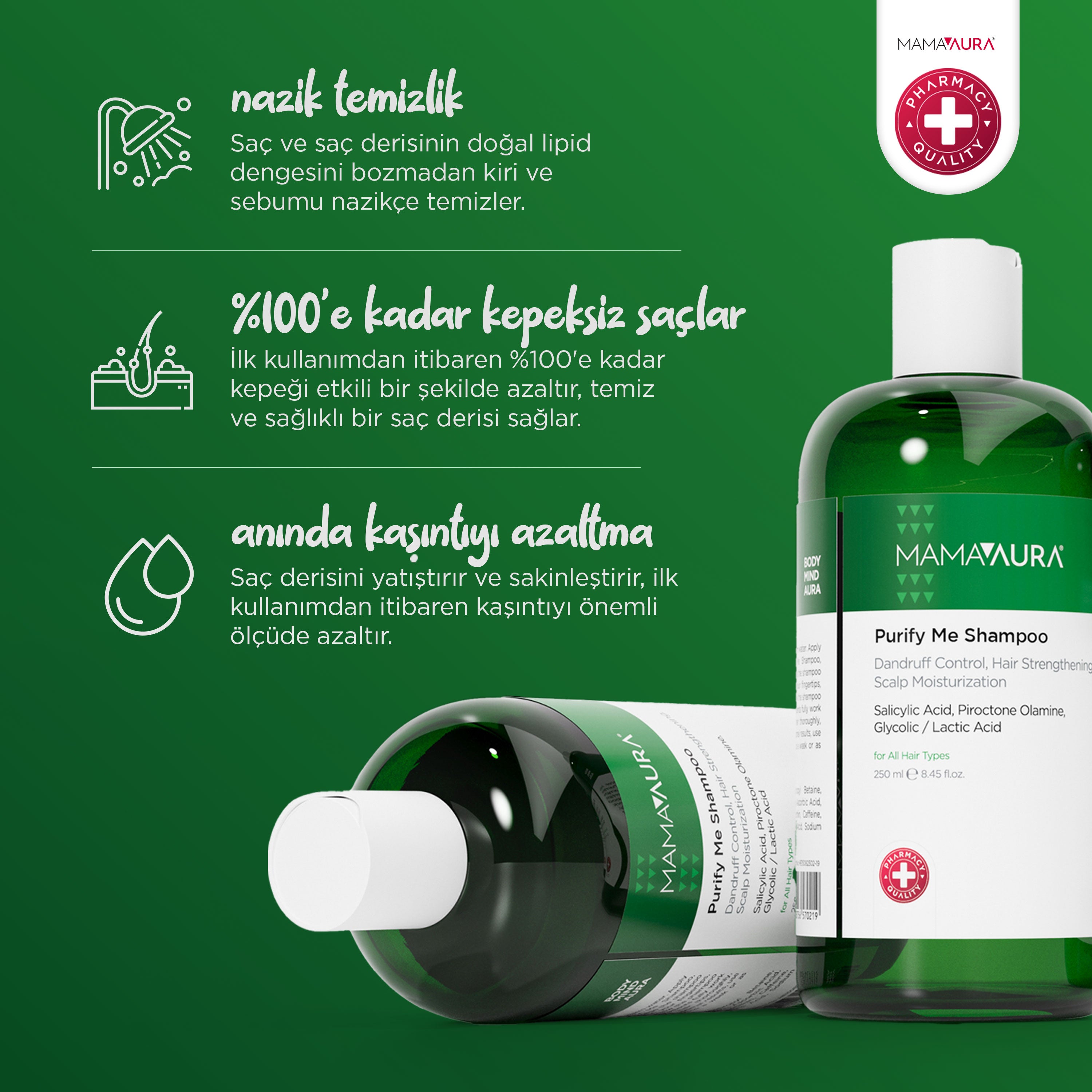 Mamaaura olarak, vücudunuza en iyi bakımı sunmayı önemsiyoruz. Mamaaura Purify Me Şampuan, kepek ve fazla yağı giderirken doğal lipid dengesini koruyarak saç derinizi derinlemesine temizler. Salisilik Asit ve Pirokton Olamin gibi bileşenlerle formüle edilen bu şampuan, kepeği etkili bir şekilde azaltır ve yeniden oluşumunu önler. Saçlarınızı ve saç derinizi taze ve sağlıklı hissederken, temiz ve beslenmiş bir saç derisinin getirdiği özgüveni kucaklayın.