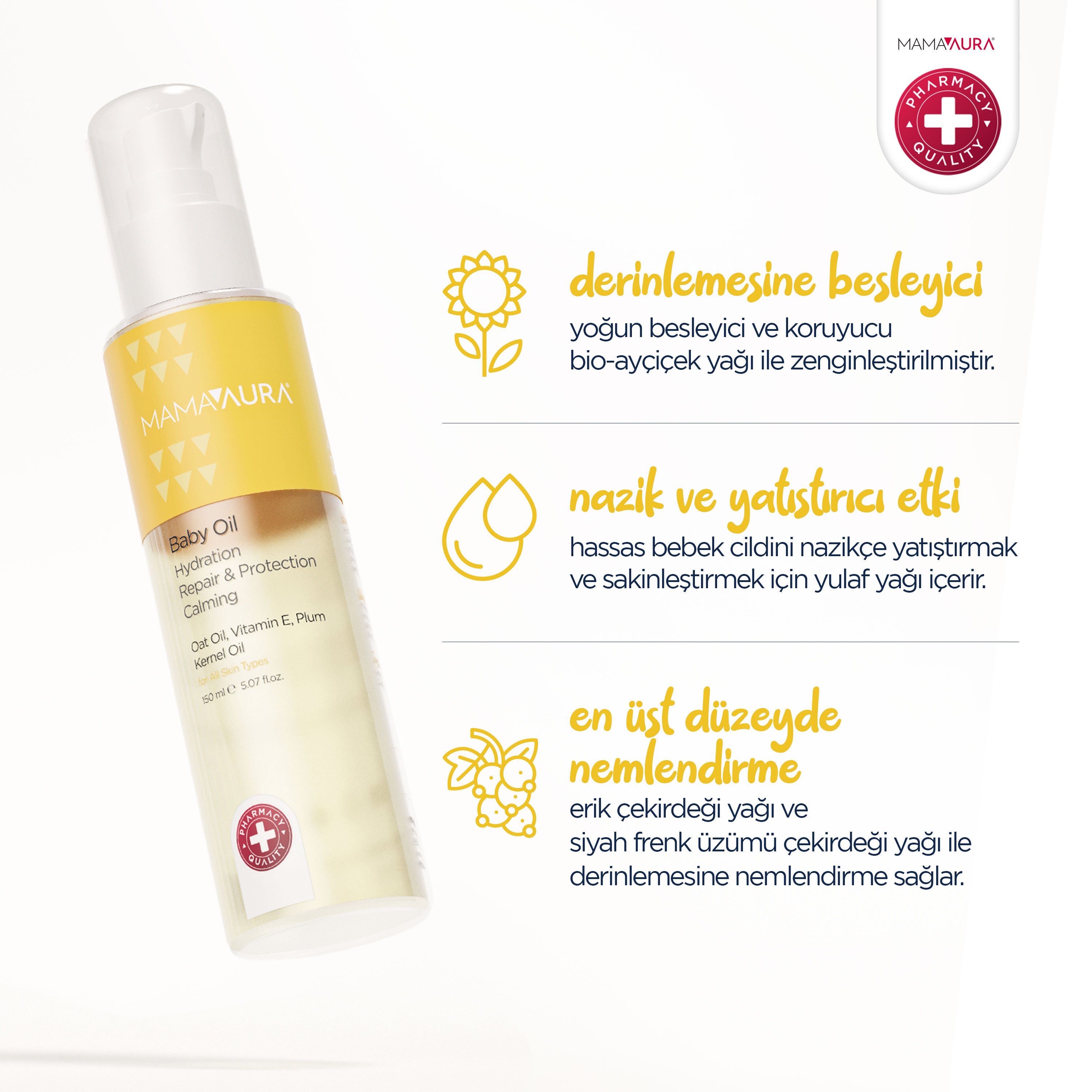 Mamaaura Baby Oil, bebeklerin hassas ciltleri düşünülerek geliştirilmiş nazik bir bakım yağıdır. Çok yönlü formülüyle nemlendirme, masaj, pişik öncesi bakım ve saç derisi desteği gibi pek çok amaçla kullanılabilir. Gıda sınıfı içeriklerle formüle edilmiş olması sayesinde, özellikle yeni doğan döneminde güvenle tercih edilebilir.